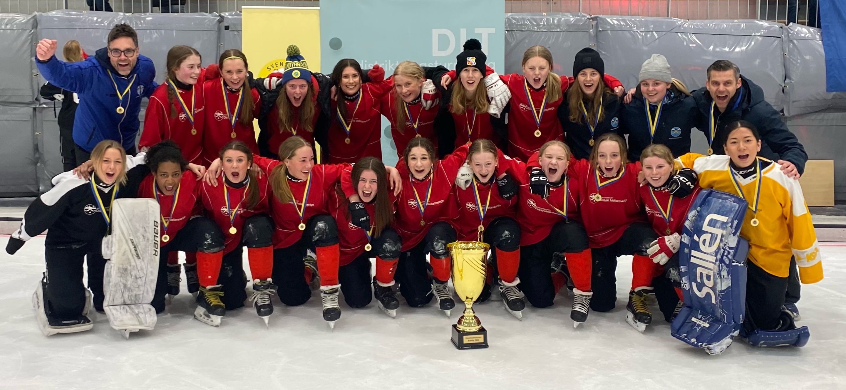 Distrikt Mellansverige F16 tog guld i Distriktlagsturneringen Under helgen 24-26 match har DLT gått av stapeln i Stockholm på Gubbängen. 28 Mar 19:23, 2023 Det är sex distrikt för F16 och P16 som har tävlat i gruppspel, semifinaler och finaler. Distrikt Mellansveriges båda lag gjorde en riktigt bra insats under turneringen. Båda lagen tog sig till semifinal för första gången på många år. P16 kämpade och slet men fick tyvärr se sig slaget med en uddamålsförlust mot distrikt Nord i semifinalen. Men en riktigt bra insats av grabbarna! Mellansveriges tjejer började sin första match med en förlust mot Västergötland med 2-4. I och med att det var första matchen som dessa tjejer spelade tillsammans i denna laguppställning så var de inte helt på banan i samspelet. Passningarna hittade inte fram och kommunikationen hade inte fallit på plats ännu. Även om det blev bättre efter hand. Tror ändå att laget hämtade mycket positivt från den matchen. Klockan 22:00 på fredagskvällen var det dags för match nummer två i gruppspelet där vi ställdes mot Småland. Till denna match hade vårt lag hittat ett betydligt bättre samspel och matchen slutade 7-0 till oss. Nu satt passningarna och spelet! Efter en skön sovmorgon, go frukost, lite yoga och häng med polare var laget redo för match mot Sydväst. Nu var det inget snack om saken, Mellansverige hade matchen i sin hand. Starka både defensivt och offensivt och publiken fick se en stabil match där slutresultatet blev 8-0 till Mellansverige. I och med denna seger blev vi klara för semifinal.Den kom att spelas samma dag bara en och halvtimme efter deras förra match. Nu var det bara dags att ladda på med lite mat och vila en stund. 19:00 på lördagen var det dags för semifinal mot distrikt Nord. Redan innan känner man att tjejernas energi är på topp och viljan att vinna mot Nord är stark. Någonstans finns tankarna, tänk om vi vinner denna match då är vi i final. Denna känsla gjorde att vi hade ett gäng peppade och spelsugna tjejer som äntrade isen. Vårt lag höll en hög press under stora delar av matchen och vi gick segrande ur den kampen med 5-0 till Mellansverige. Tjejerna var riktigt glada och nöjd efter denna match och hade sen en skön kväll på hotellet där spelade pingis och hänge med spelare från andra lag. Vi följde på storskärm även våra P16 killarna i deras semifinal som spelades mot Nord. Vi såg att de slet och kämpade men fick tyvärr se sig besegrade med en uddamåls förlust 3-4. Men det var riktigt bra jobbat av killarna. Heja P16! Klockan 14:00 på söndagen kom finalen att gå av stapel för F16 mellan Mellansverige och Västergötland. Spelarna var nog lite extra sugna på att få möta detta lag en gång till eftersom de förlorade första matchen mot dem. Spelarna kändes otroligt spelsugna och hade guld i sikte. Mest nervösa var nog medföljande supportrar som hejade och tutade för allt de kunde för att stötta tjejerna. Redan 1:52 in i matchen så sätter Hilda Kolsmyr mål nummer ett och glädjen blir stor hos alla som heja på Mellansverige. Cirka sju minuter senare gör vi 2-0 genom Ellen Arnio. Mellansverige har matchen, vårt försvar sätter stopp och låter inte Västergötland komma igenom. När första halvlek är slut är ställningen 3-0 till oss och det är en bra känsla hos spelare, ledare och publik. Efter cirka åtta minuter in i andra halvlek så stänker Hilda Kolsmyr in sitt tredje mål under matchen till 4-0 och det resultatet håller sig hela vägen fram tills slutsignalen tjuter. Glädjen är total hos tjejerna, ledarna och publiken! En mycket väl genomför DLT av F16 Mellansverige som ledde hela vägen fram till GULD! Grattis till alla inblandade men framförallt ett stort grattis till alla tjejerna i F16 Mellansverige!