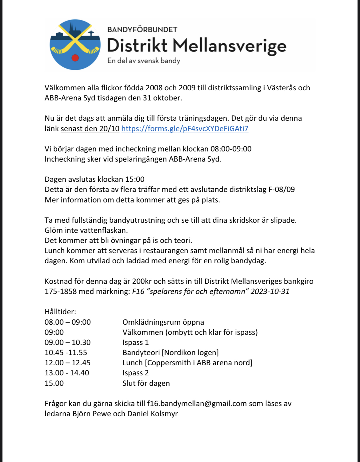 Inbjudan till distriktslagsamling F16 Välkommen alla flickor födda 2008 och 2009 till distriktssamling i Västerås och ABB-Arena Syd tisdagen den 31 oktober. 9 Oct 14:24, 2023 Till anmälan: https://forms.gle/pF4svcXYDeFi... Inbjudan 2023 10 31 Välkommen till säsongens första Mellansverige F16 08 09 träff